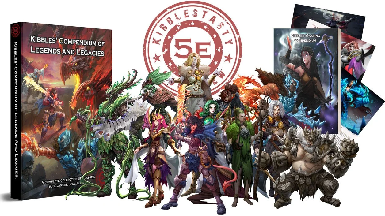 Want to sign up to be notified of KibblesTasty’s future Kickstarters? Enter your email to get on the notification list. Next Kickstarter is Kibbles’ Compendium of Legends and Legacies, a massive book of martial might and magical mayhem for D&D 5e - 4 epic new classes, 30+ new subclasses, 30+ feats, and over 240 spells!